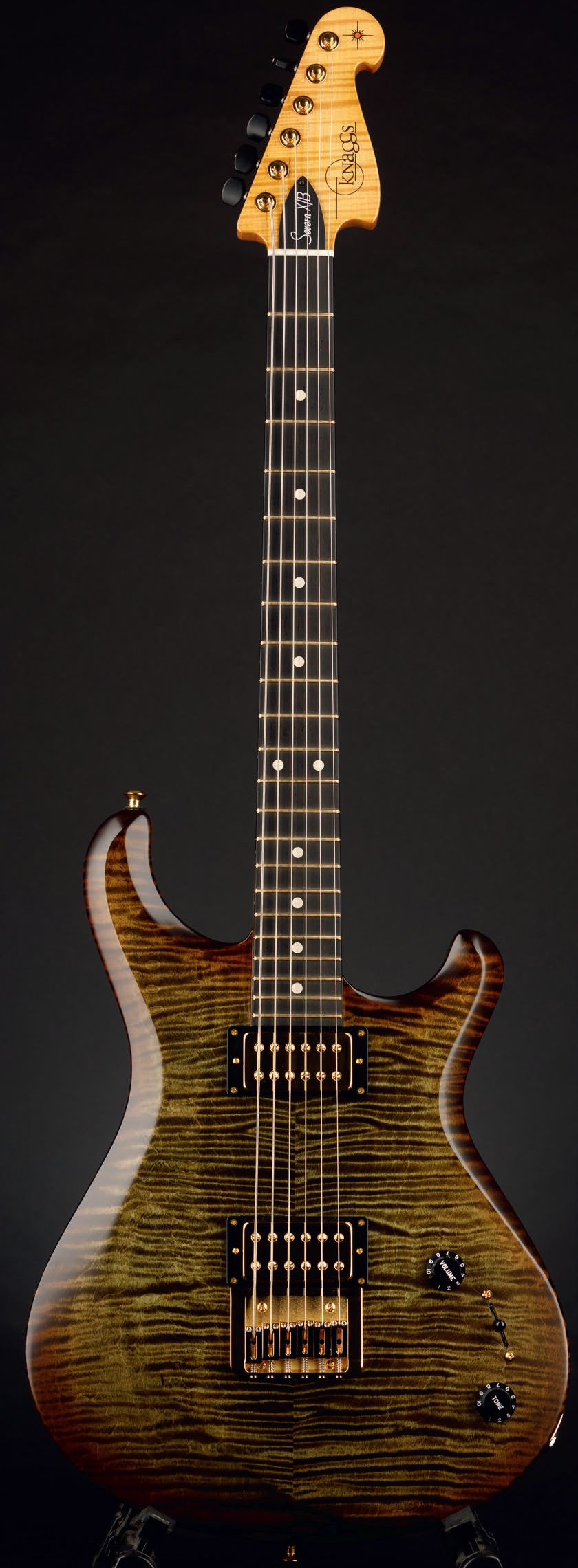 Semi-Gloss finish, ‘Hardtail’, Double cutaway solid body, flat body, six on a side, 25.5’ scale, set neck, Neck Shape – Knaggs 7