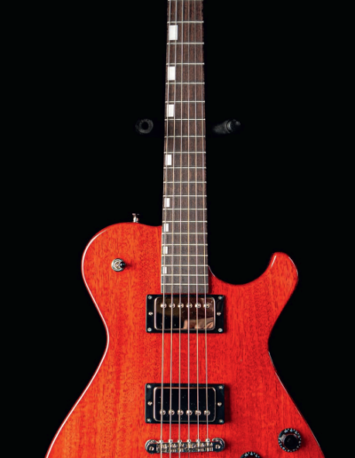 Gloss finish, Single Cutaway solid body, flat top and back, 3 on a side, 24.75’ scale, set neck,
